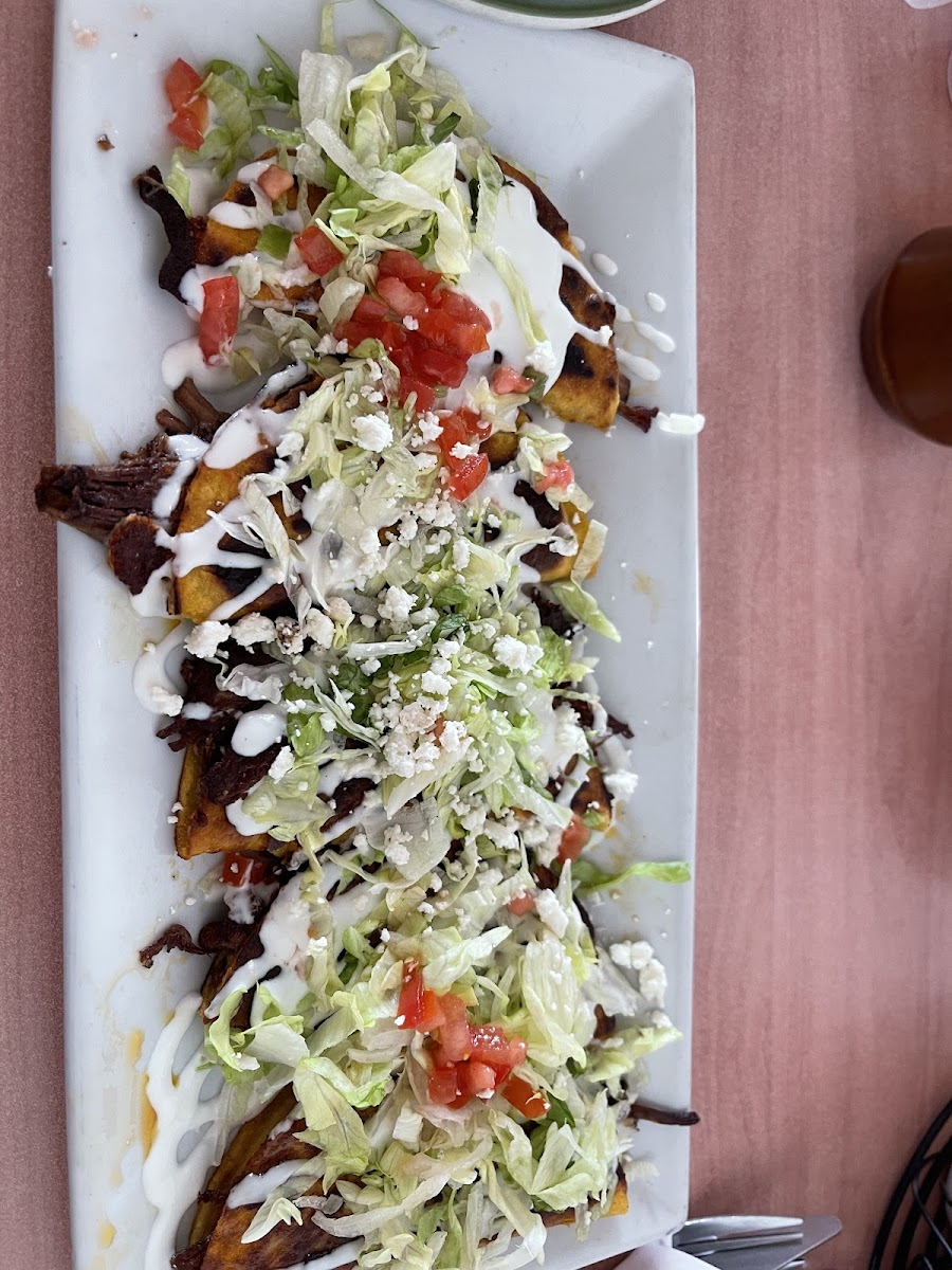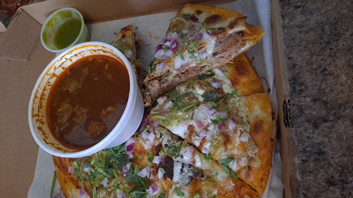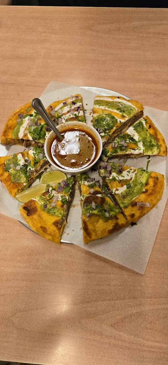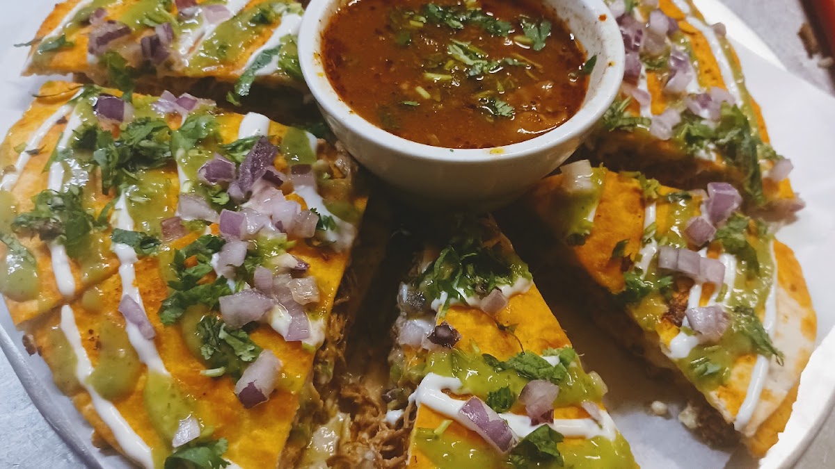 This place was very tasty!! We got way more food than we expected and no prices on the menu left us surprised with the bill. The pizzabirria is a 3 pound birria cut like a pizza(pictured) the nachos were very tasty as well!